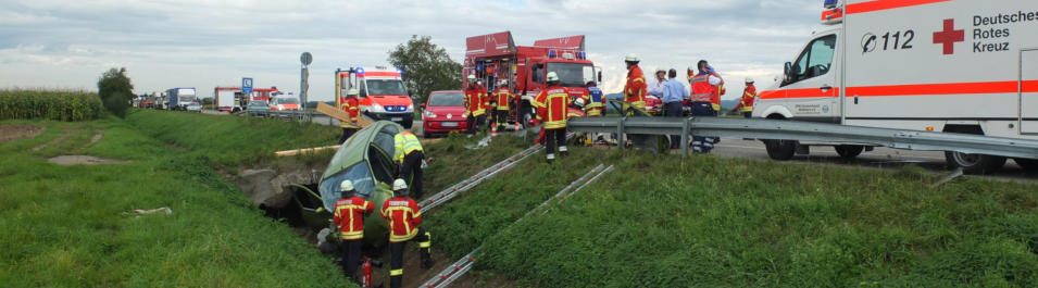 Beginn:Einsatzstichwort:19.09.2014 14:31Hilfeleistung H3: Person in ZwangslageEinsatzort:B31 bei OberrimsingenFahrzeuge im Einsatz:LF10/6, LF10/6 (OR), ELW 1, VRW, LF 20/20, RW 2, (Breisach) Einsatzbericht:Auf der B31 ereignete sich ein Verkehrsunfall zwischen einem Pkw und einem Kleintransporter. Der PKW lag im Graben, eine Person war eingeklemmt.Der PKW wurde mit der Seilwinde des Rüstwagens gesichert und die Person mit hydraulischen Rettungsgeräten befreit. Der Fahrer des Kleintransporters war ebenfalls im Fahrzeug eingeschlossen und musste befreit werden.Anschließend wurden noch auslaufende Betriebsstoffe mittels Bindemittel aufgenommen sowie die Leitplanke mit dem Trennschleifer entfernt.Neben der Abteilung Breisach waren auch die Abteilungen Oberrimsingen und Niederrimsingen sowie Rettungsdienst und Polizei im Einsatz.Presse:Badische Zeitung - Nach Unfall am Rimsinger Ei: B31 ist wieder frei Regio Trends - Verkehrsunfall am "Rimsinger Ei" - Verkehrsinsel überfahren .......Einsatzbericht: Feuerwehr BreisachBilder: Feuerwehr Breisach Abt. Niederrimsingen